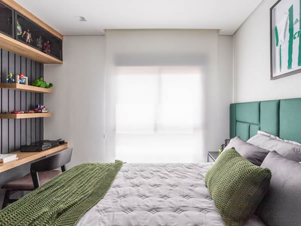 Uma cabeceira de cama em tom de verde é uma opção sofisticada para renovar o visual do quarto, em tons de verde esmeralda ou musgo, em acabamentos foscos ou polidos e em revestimentos de madeira ou veludo, o profissional do BMA Studio diz que a cabeceira verde acrescenta um ponto focal no dormitório e um clima de relaxamento.