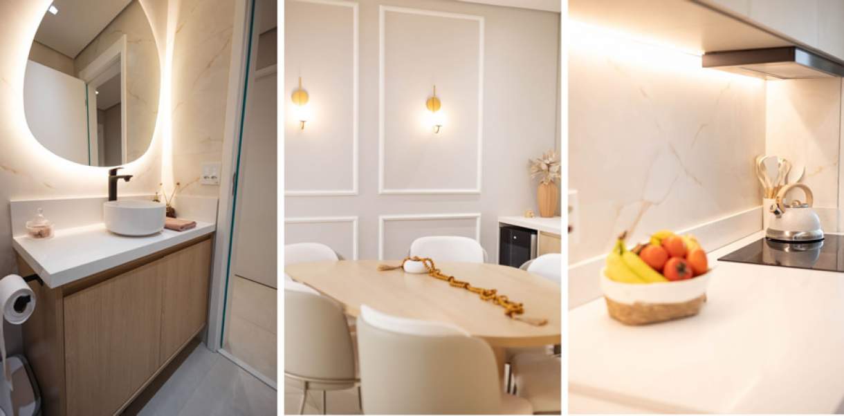 “A iluminação é uma das ferramentas mais poderosas para transformar um espaço. Cortinas leves, cores claras nas paredes e o uso estratégico de espelhos ajudam a potencializar a luz natural e ampliar visualmente o ambiente. A luz natural desperta a vitalidade. Já a iluminação indireta e suave, como as fitas de LED em nichos e prateleiras, contribui para criar uma atmosfera mais calma e agradável”, afirma.
