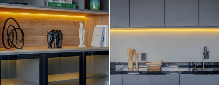 Neste projeto, a ResiliArt Arquitetura mostra como é possível alinhar a automatização com a estética dos ambientes: as fitas de LED embutidas na marcenaria podem ser acionadas ou desligadas com um simples comando de voz | Foto: Eryck Patryck
