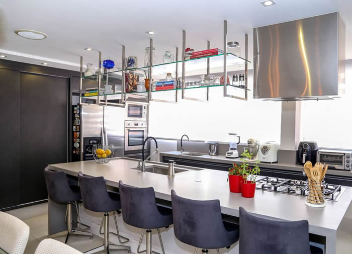 Nesse projeto assinado pelos arquitetos Mariana Meneghisso e Alexandre Pasquotto, a coifa é primordial para que os moradores possam usar a bancada para as refeições | Projeto Meneghisso & Pasquotto Arquitetura | Foto: Divulgação