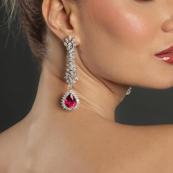 Categoria The Muse Originality: brincos inspirados em bromélias, com rubelitas em forma de pêra (18,49 ct) e 128 diamantes (14,32 ct), também em ouro branco 18k. Um tributo à flora brasileira com leveza, cor e exuberância tropical.