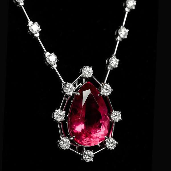 Categoria Timeless Elegance: colar com rubelita em corte "faca" de 11,81 ct e 301 diamantes totalizando 12,42 ct, em ouro branco 18k. Uma joia de traço clássico e aura atemporal, com forte presença e refinamento.