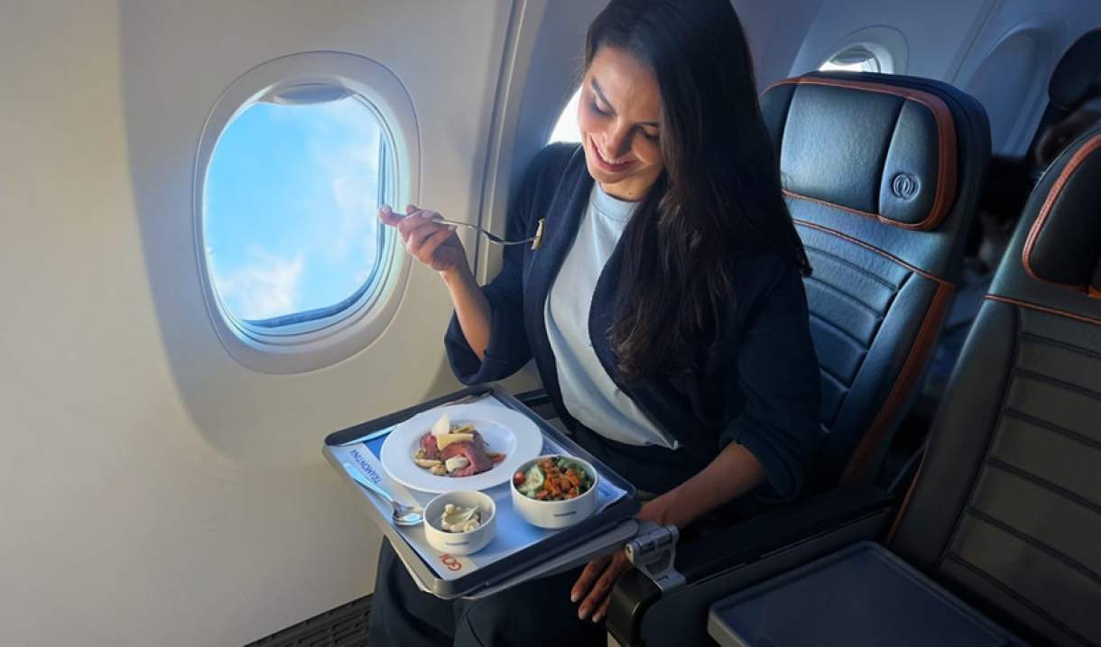 O serviço de bordo da classe Premium Economy foi realizado com peças selecionadas do portfólio de porcelanas da marca: tigelas Paola, prato de sobremesa Mesh, além de talheres em aço inox da linha Cannes. O novo cardápio, desenvolvido pela companhia aérea exclusivamente para a ocasião, trouxe como entrada uma salada de mix de alface com cenoura cozida ao cominho e coentro, acompanhada de rodelas de abobrinha chapeada. O prato principal incluiu picanha defumada com lascas de parmesão, muçarela de búfala, alcaparras e tomate. Já a sobremesa foi um brownie de chocolate com creme praliné Paris-Brest, folha de chocolate branco, caramelo salgado e avelã. Houve também opção vegetariana disponível.