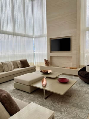 No living desse duplex projetado pelas arquitetas Danielle Dantas e Paula Passos, o tapete não ofusca a elegância do painel de mármore travertino da TV e o mobiliário. Na leitura das especialistas, por aqui houve uma complementação dentro da atmosfera predominante no décor | Projeto Dantas & Passos Arquitetura | Foto: Maura Mello