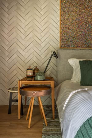 A parede do quarto ganhou um revestimento cimentício com efeito 3D em padrão chevron | Projeto Dantas & Passos Arquitetura | Foto: JP Image