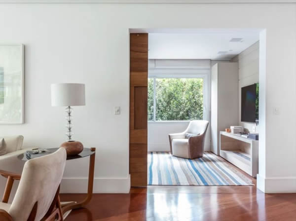 A escolha por utilizar listras no tapete conferiu uma sensação de continuidade visual nesta sala de TV | Projeto Dantas & Passos Arquitetura | Foto: Maura Mello