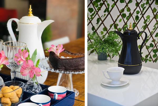 Para acompanhar o chá, a empresa Keita traz uma série de utensílios para armazenar os alimentos, como mantegueiras; porta queijos, pães e bolos; bandejas, entre outros, em diversos modelos e tamanhos.
