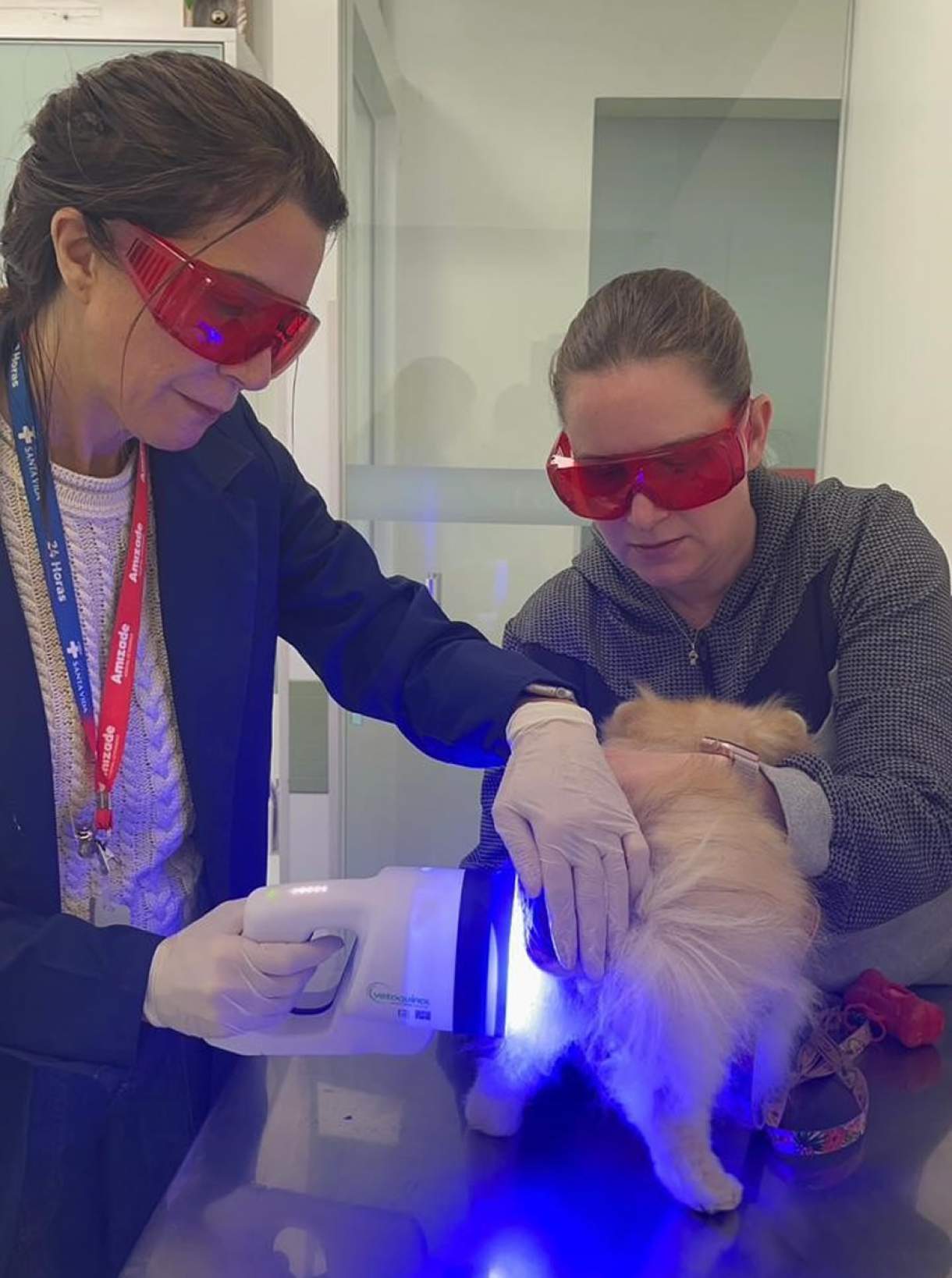Contudo, o diferencial no processo de recuperação da pele foi a inclusão da fotobiomodulação por meio do Phovia, tecnologia inovadora da Vetoquinol, que acelera a regeneração da pele e permite reduzir o tempo de uso de medicamentos sistêmicos, favorecendo uma recuperação mais rápida, segura e confortável para o pet. A terapia utiliza a emissão de uma luz de LED azul em conjunto com um gel com partículas cromóforas aplicado sobre a lesão. Essa interação gera a Energia Lumínica Fluorescente (ELF), que atua diretamente na pele, primeiro controlando a inflamação e reduzindo a multiplicação de bactérias. A partir disso, estimula a formação de novos vasos sanguíneos, melhora o aporte de oxigênio e nutrientes ao tecido e favorece a produção de colágeno, acelerando a cicatrização e a renovação das camadas superficiais e profundas da pele.