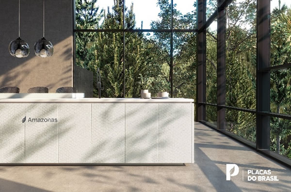 Exaltando a brasilidade, a Placas do Brasil também tem seu branco, traduzido no padrão Amazonas, da Coleção Vozes. Exclusivo da marca, o produto é inspirado na pele do gigante da Amazônia, o peixe Pirarucu, e também pode ser encontrado em tom mais escuro. O traço da pele do peixe é uma expressão única pela sua ancestralidade. Inspira, colabora e fortalece laços com a mãe natureza nesta história milenar entre o peixe e o homem. A cor clara e esbranquiçada com nuances de tons levemente rosáceos a terrosos vem do encontro dos rios que percorrem a Amazônia: o Rio Negro e o Solimões, que quando se unem se transformam no Rio Amazonas.
