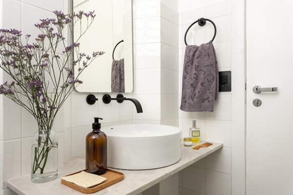 Cuba de apoio redonda Celite Slim na cor branca e acabamento brilho – Projeto da arquiteta Mariana Wilderon. (Crédito: Leila Viegas)
