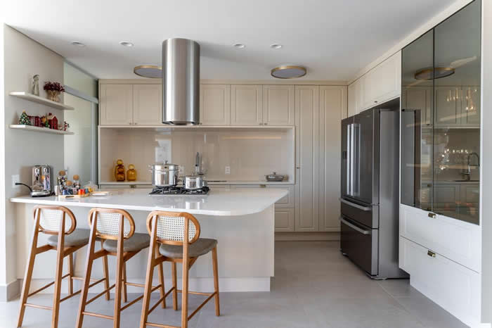 Outra possibilidade é adotar o tom também na bancada, como neste projeto da Predilecta Móveis Sob Medida, que utiliza o acabamento Color Matte na cor Alpes para criar uma composição elegante e harmoniosa.