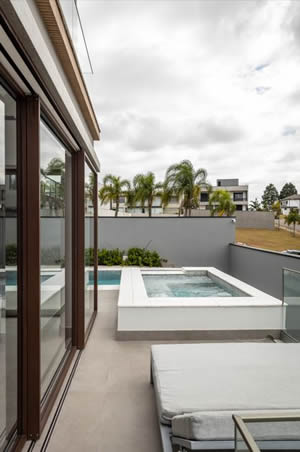 Em declive, neste projeto arquitetos Mariana Meneghisso e Alexandre Pasquotto optaram por posicionar a área de lazer em caimento com deck, jardim e piscina conectados | Projeto Meneghisso & Pasquotto Arquitetura | Foto: Divulgação