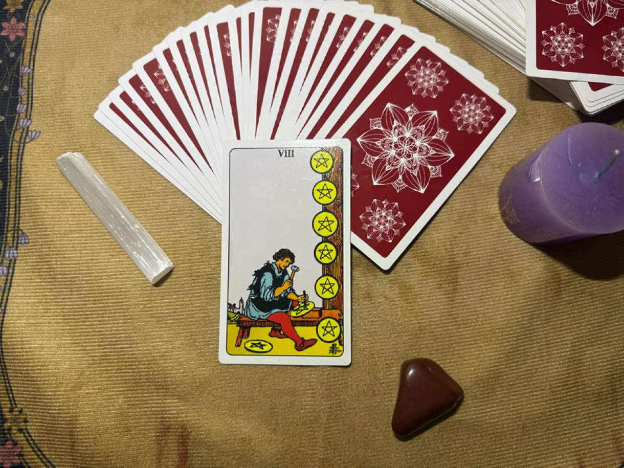 O 8 de Ouros é o arquétipo do artesão. Na imagem da carta, vemos alguém concentrado em esculpir suas moedas, uma a uma, buscando excelência em cada detalhe. Segundo Juliana Viveiros, essa figura simboliza o mergulho total no aprendizado e na prática, com humildade e constância.