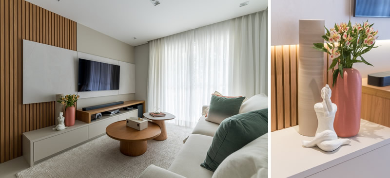 Neste ambiente, a nuance clara do off-white é representada pela composição de diversos fatores que englobam desde o aspecto amadeirado do painel, o piso claro e o sofá cinza| Projeto: Cinthia Claro Arquitetura| Foto: Erika Waldmann