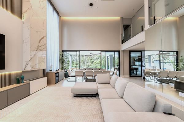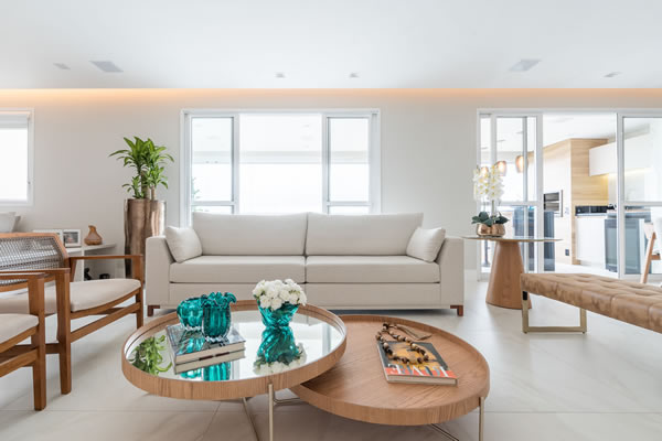 Priorizar a iluminação natural na maior parte do dia é premissa primordial. Nesse contexto, Cinthia ressalta a presença de amplas esquadrias combinadas com cortinas leves, móveis claros e ambientes integrados. À noite, luminárias, pendentes, abajures e velas contribuem para aquecer o lar e torná-lo mais convidativo.