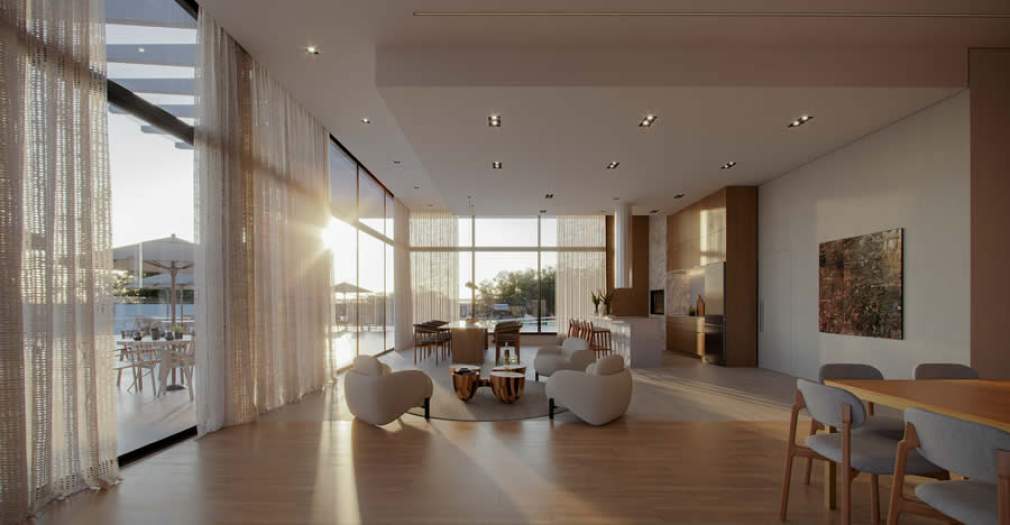 Além da oferta de lazer, o condomínio se destaca pela sofisticação arquitetônica dos espaços comuns, assinados por Eli Loyola, arquiteto reconhecido por projetos que priorizam o uso real dos ambientes e a integração entre arquitetura e paisagem. No local, essa visão se traduz em áreas pensadas para funcionar no dia a dia, com linguagem contemporânea e soluções que favorecem circulação, convivência e conforto.