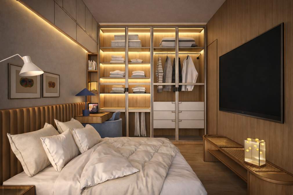 Dentro da unidade, o design opera quase como engenharia de precisão. Mobiliários multifuncionais, marcenaria planejada até o teto, camas retráteis, mesas rebatíveis e soluções inspiradas em barcos e habitações móveis mostram que conforto não depende de metragem, mas de inteligência espacial. Cada centímetro é aproveitado com propósito, transformando restrição em criatividade.