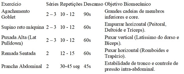 Na prática, isso permite treinos mais curtos e menos frequentes. Um modelo considerado eficiente é o treino de corpo inteiro, realizado duas ou três vezes por semana, com duração de 30 a 45 minutos. A recomendação é priorizar exercícios multiarticulares, que envolvem vários grupos musculares ao mesmo tempo, com duas a três séries por exercício.