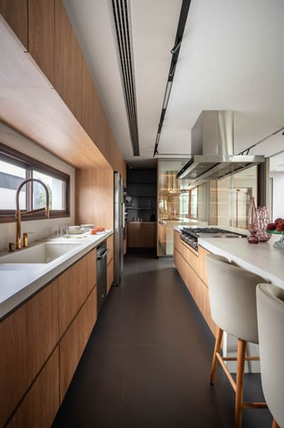 Nessa cozinha integrada, a cristaleira com portas em vidro reflecta espelha o ambiente, mas foi posicionada longe da área de preparo | Projeto Meneghisso & Pasquotto Arquitetura | Foto: JP Image