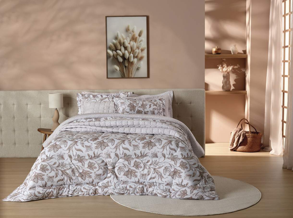 O encontro de elementos opostos é interpretado em perfeita harmonia nesse coordenado de cama. Edredom e Cobre Leito estampam de um lado o floral sutil e orgânico. Em outra face, grafismos remetem à onça, reinterpretada com leveza. A coleção conta ainda com fronhas lisas e estampadas, lençóis e sobre–lençol, solteiro, casal, queen e king size.