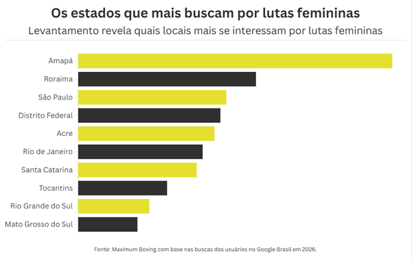 Um estudo da Maximum Boxing, referência em equipamentos de esporte de combate, analisou buscas por “muay thai feminino”, “boxe feminino”, “sumô feminino”, “MMA feminino” e “judô feminino” entre fevereiro de 2025 e janeiro de 2026. Foram 70.070 pesquisas, e o levantamento também apontou os estados com maior volume proporcional por 100 mil habitantes.