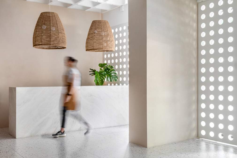 O resultado acompanha uma tendência crescente no setor: ambientes que não competem com o produto, mas o potencializam. “Na Caramelia, o design atua como extensão da experiência gastronômica, convidando o público a desacelerar e ressignificar momentos simples do dia a dia”, explica. O balcão monolítico em mármore branco contrasta com a leveza das luminárias em fibra natural suspensas sobre o atendimento, criando um equilíbrio entre solidez e delicadeza. Já a fachada e as divisórias internas são marcadas por um painel perfurado com aberturas circulares, elemento que filtra a luz natural e projeta desenhos orgânicos ao longo do dia.