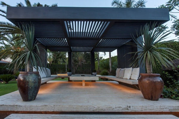 Solto no jardim, o pergolado foi concebido como um refúgio de estar privativo e acolhedor, pensado para momentos de boas conversas, sem interferir na rotina e no conforto de quem está na casa | Projeto de paisagismo: Depieri Paisagismo | Projeto de arquitetura: MAAI Arquitetura | Foto: Clausem Bonifacio