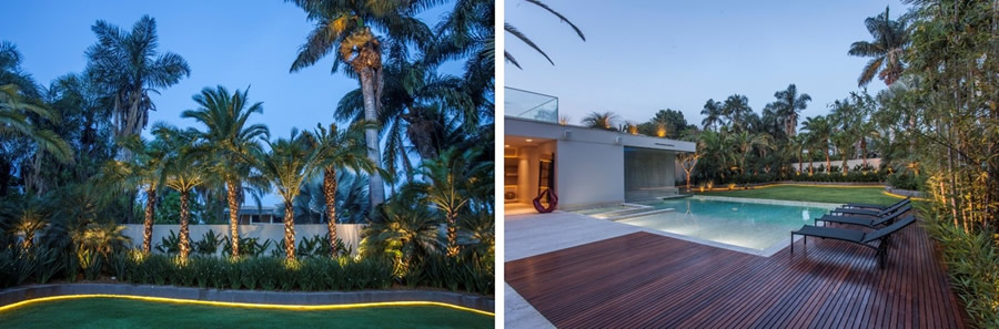 Na primeira foto, a área de lazer com piscina recebeu uma barreira verde. Palmeiras como tamareiras, canarienses e carpentárias ajudam a criar sombras, tornando o ambiente mais fresco. Na segunda imagem, exemplo de entrada lateral repleta de espécies. | Projeto de paisagismo: Depieri Paisagismo | Projeto de arquitetura de Denise Zuba Arquitetos | Fotos: Divulgação