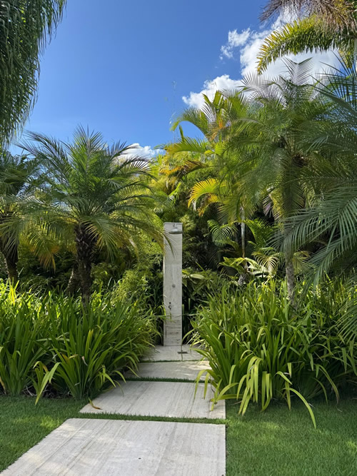 Envolta pelo verde, a área da ducha cria uma atmosfera natural e tranquila | Projeto de paisagismo: Depieri Paisagismo | Foto: Divulgação