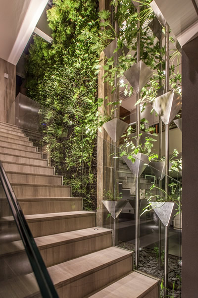 Diversas espécies formam uma parede vertical na área interna desta residência | Projeto de paisagismo: Depieri Paisagismo | Projeto de arquitetura: Denise Zuba | Foto: Clausem Bonifacio