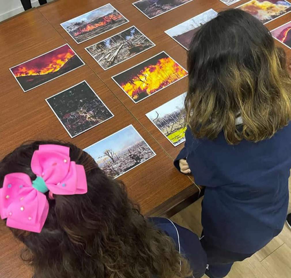 Alunas do Ensino Fundamental - Anos Iniciais, do Colégio Marista Arquidiocesano, olham fotos que mostram as queimadas e seus efeitos nas florestas