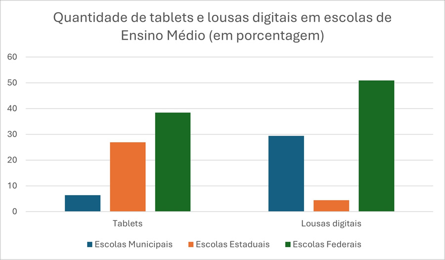 O uso de tecnologias que vão além dos computadores na sala de informática é baixíssimo nas escolas de ensino fundamental: em escolas municipais, apenas 12,5% delas tem lousa digital nas salas e 14,3% delas tem acesso a tablets para alunos. Já em escolas estaduais, a porcentagem de tablets e lousas digitais sobe para 26% e 28.4% respectivamente. As escolas federais detêm a maior concentração da tecnologia, com 32,7% delas fornecendo tablets para os estudantes e 53,1% contam com lousas digitais.
