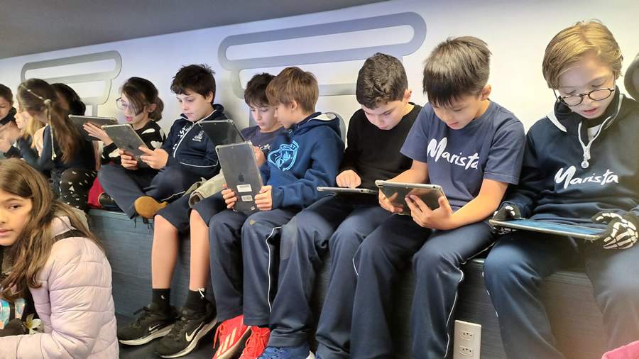 Alunos utilizam tablet para responder a um questionário sobre os jogos e sites mais utilizados por eles (Imagem: Divulgação MKT Colégio Marista Arquidiocesano)