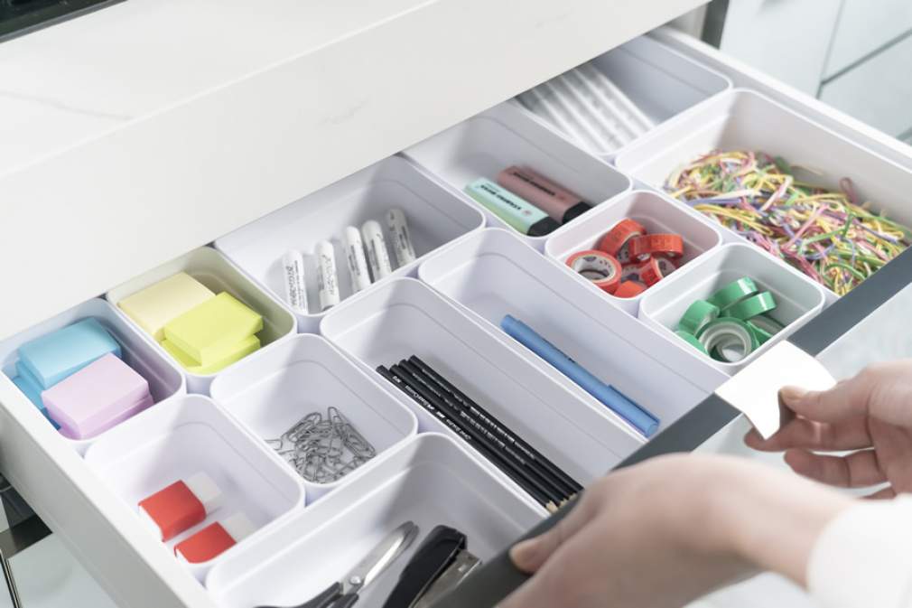 Gavetas com colmeias e caixas organizadoras ajudam a manter o visual limpo e facilitam a manutenção da ordem. “Organizadores modulares e da mesma cor, como os da linha Logic, da Ou, não só facilitam a organização e visualização de itens pequenos, como são ótimos para todos os tipos e tamanhos de gavetas, possibilitando montar as divisões de acordo com a necessidade do estudante”, exemplifica Josi.