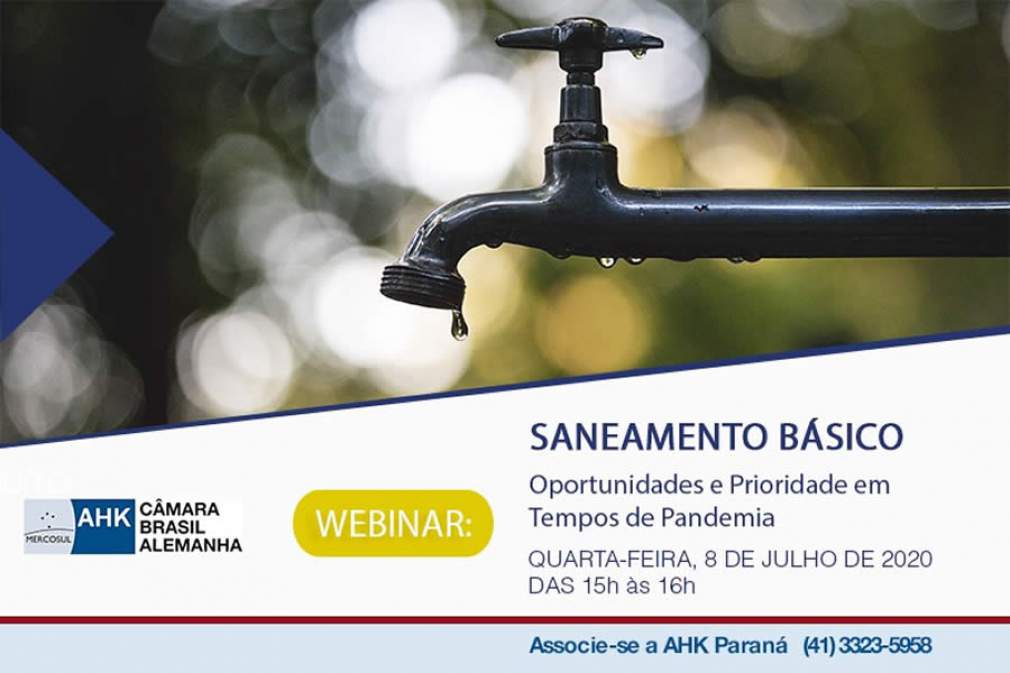 A Câmara de Comércio e Indústria Brasil-Alemanha (AHK Paraná) promove, no dia 8 de julho, das 15h às 16 horas, um webinar com o tema "Saneamento Básico: Oportunidades e Prioridades em Tempos de Pandemia”. O evento on-line mostrará oportunidades às empresas em relação ao Novo Marco do Saneamento Básico.