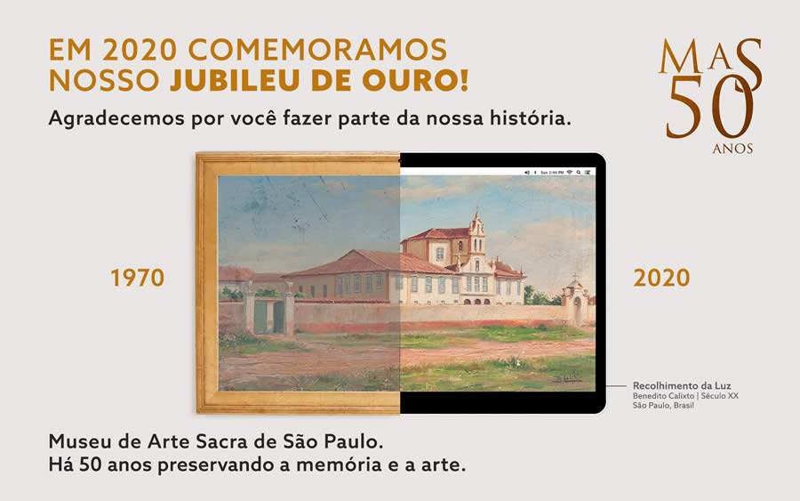Este ano, estão previstas várias ações para comemorar os 50 anos do MAS/SP. O grande destaque dessas comemorações foi o lançamento da primeira e maior coleção relacionada a arte sacra e barroca no ambiente virtual do Brasil. Em parceria com o Google, o perfil do museu na plataforma Google Arts & Culture, apresenta mais de 200 peças acompanhados de textos curatoriais e comentários da equipe educacional do museu.