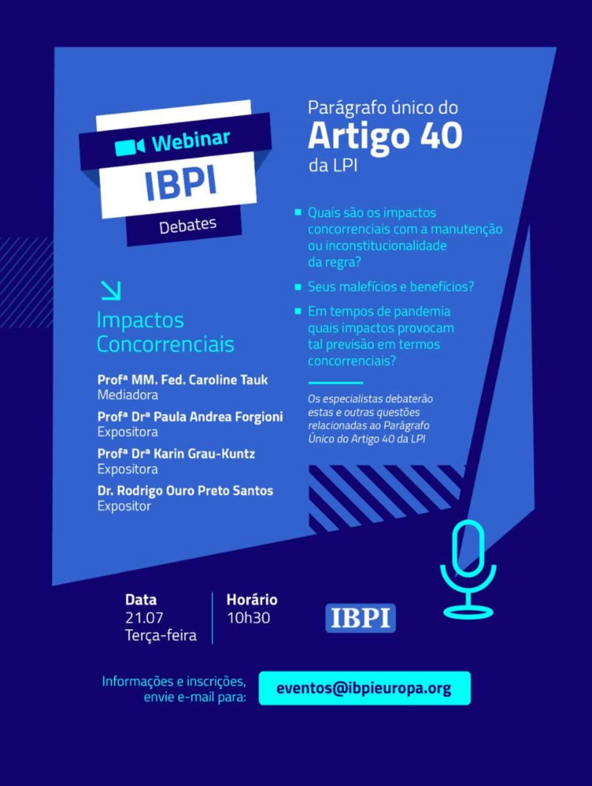 Com o intuito de fomentar a discussão em torno do Parágrafo Único do Artigo 40 da Lei de Propriedade Industrial (9.279/96), o IBPI – Instituto Brasileiro de Propriedade Intelectual promove a partir da semana que vem um ciclo de debates online com diversos especialistas.