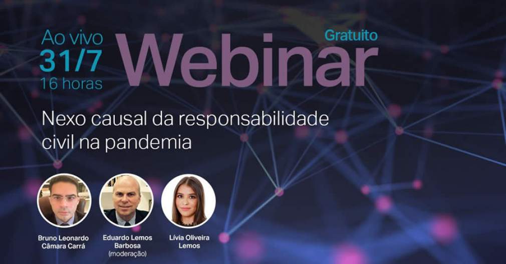 A AASP promove na sexta-feira, 31/7, às 16 horas, o webinar gratuito “Nexo causal da responsabilidade civil na pandemia”. Participam os seguintes expositores: Bruno Leonardo Câmara Carrá, Lívia Oliveira Lemos e Eduardo Lemos Barbosa.