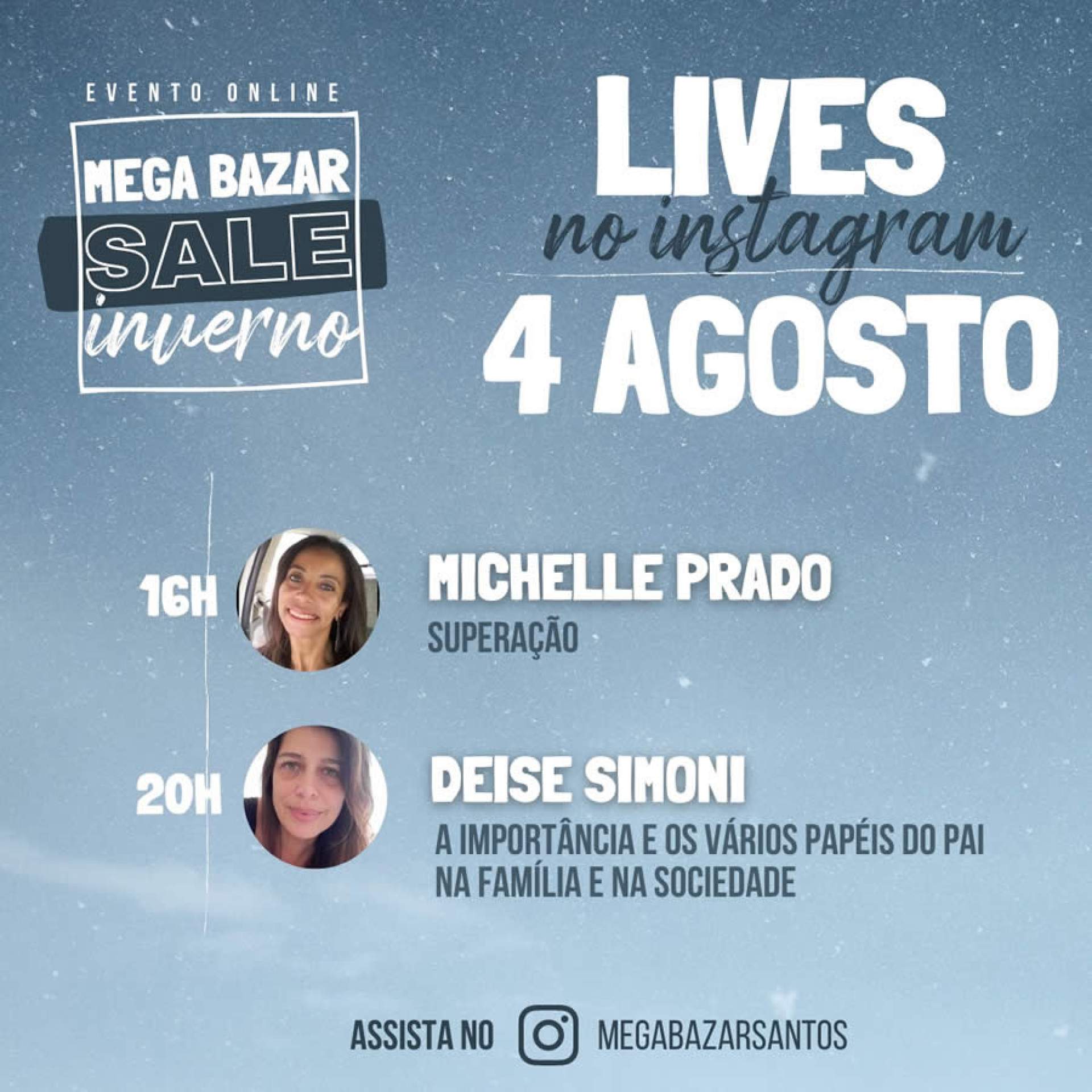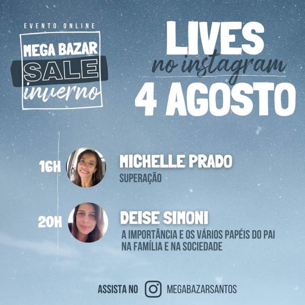 Inovando ainda mais o Mega Bazar Santos online traz uma maratona de Lives no Instagram do evento. Nas edições anteriores as Lives aconteciam em 2 dias (um final de semana) e agora serão 7 dias de programação, de 1 a 7 de agosto.
