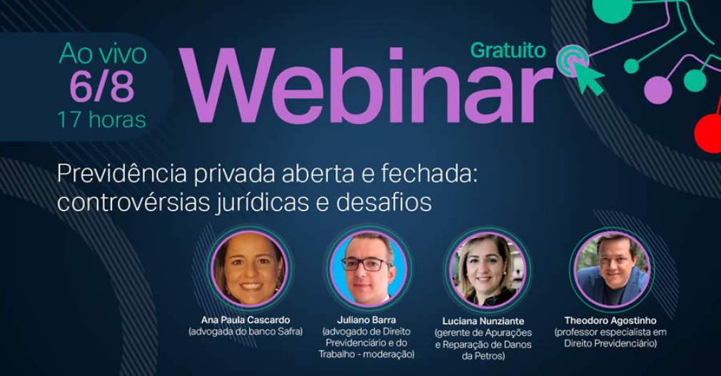 A Associação dos advogados realiza na quinta-feira, 06/08, às 17hs, o webinar gratuito “Previdência Privada Aberta e Fechada: Controvérsias Jurídicas e Desafios”.