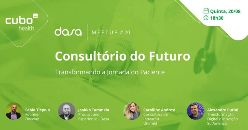 O consultório médico do futuro será tema do Meetup Online do Cubo Itaú na próxima quinta-feira, dia 20 de agosto, a partir das 18h30, no canal do YouTube do Cubo Itaú. A ideia do encontro é discutir como essa jornada do paciente vem sendo transformada de uma forma muito acelerada, devido à pandemia do novo coronavírus, e também da influência que a tecnologia pode ter em relação à área da saúde, em nível mundial. O debate terá a participação de Jaakko Tammela, Product and Experience da Dasa; Fábio Tiepolo, CEO da Docway; Alexandre Putini, Head de Transformação Digital e Inovação da SulAmérica; e Caroline Andresi, Consultora de Inovação da Unimed.