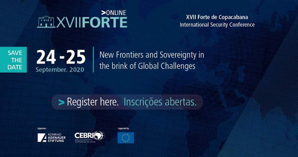 Estão abertas as inscrições para a XVII Conferência de Segurança Internacional do Forte de Copacabana, principal fórum sobre segurança internacional da América Latina. Será a primeira edição realizada de forma completamente virtual e durante dois dias: 24 e 25 de setembro. O tema deste ano é “Novas Fronteiras e Soberania Frente aos Desafios Globais”, que será debatido por especialistas divididos em painéis transmitidos ao vivo pela internet, apenas para o público inscrito. A iniciativa é da Fundação Konrad Adenauer (KAS) e do Centro Brasileiro de Relações Internacionais (CEBRI), com o apoio da Delegação da União Europeia no Brasil.