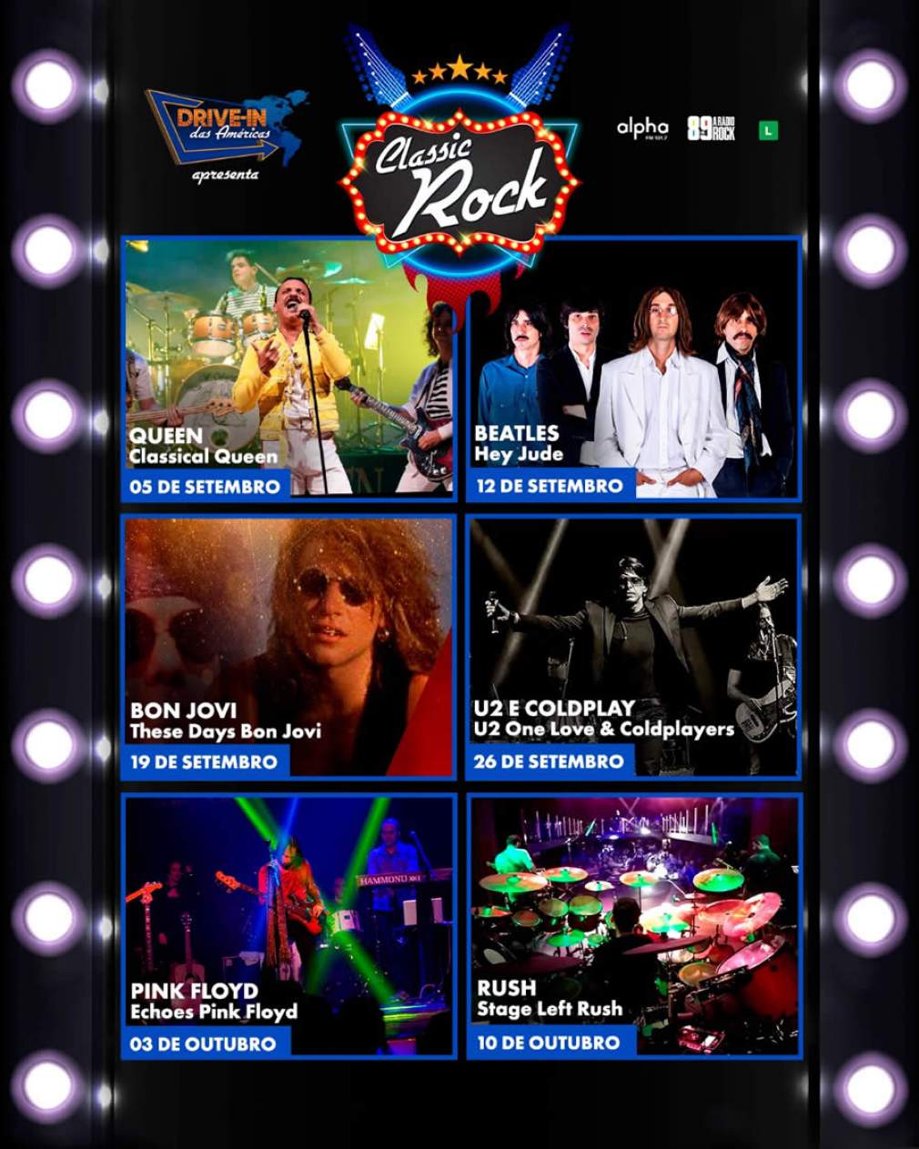 Classic Rock reúne incríveis espetáculos, que prestam sua homenagem em grande estilo, com um show especial, apostando em arranjos originais, repertório amplo e na fidelidade de vozes, figurinos e trejeitos no palco, para proporcionar ao público a sensação mais próxima de estar diante de seus ídolos. Além da sensação única de ver o show de dentro do seu carro, a transmissão do show também será feita através de um telão de LED de 14x8m, para que todos aproveitem esse momento da melhor forma.