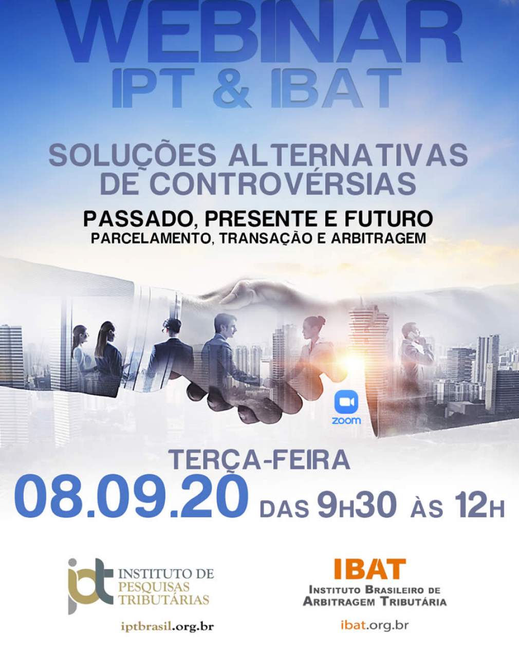 O Instituto de Pesquisas Tributárias (IPT Brasil) e o Instituto Brasileiro de Arbitragem Tributária (IBAT)realizam na terça-feira, dia 08/09, da 9h30 às 12hs, o webinar gratuito " Soluções Alternativas de Controvérsias – Passado, Presente e Futuro – Parcelamento, Transação e Arbitragem”.