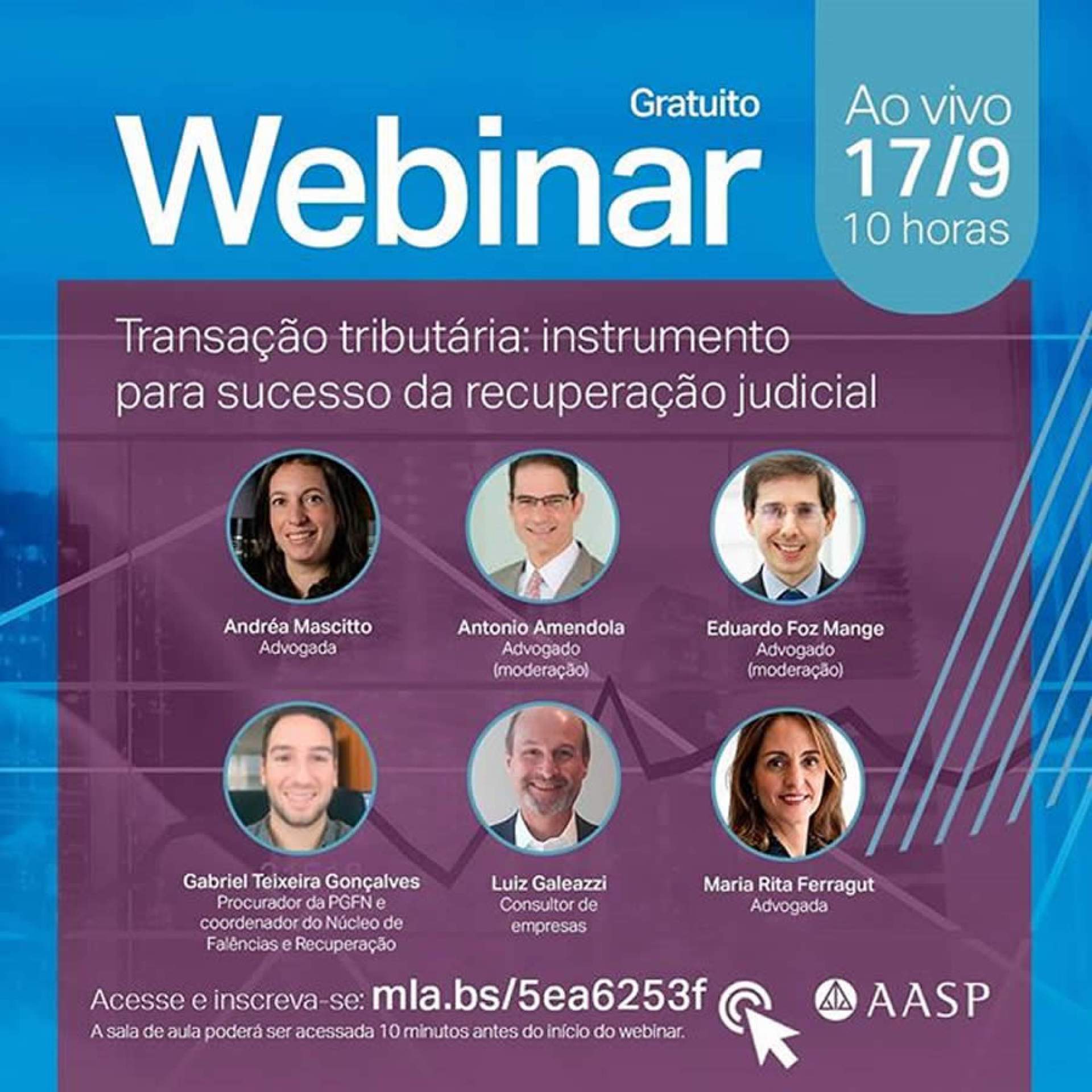 A Associação dos Advogados (AASP) promove na quinta-feira, 17/9, às 10 horas, o webinar gratuito "Transação tributária: instrumento para sucesso da recuperação judicial".