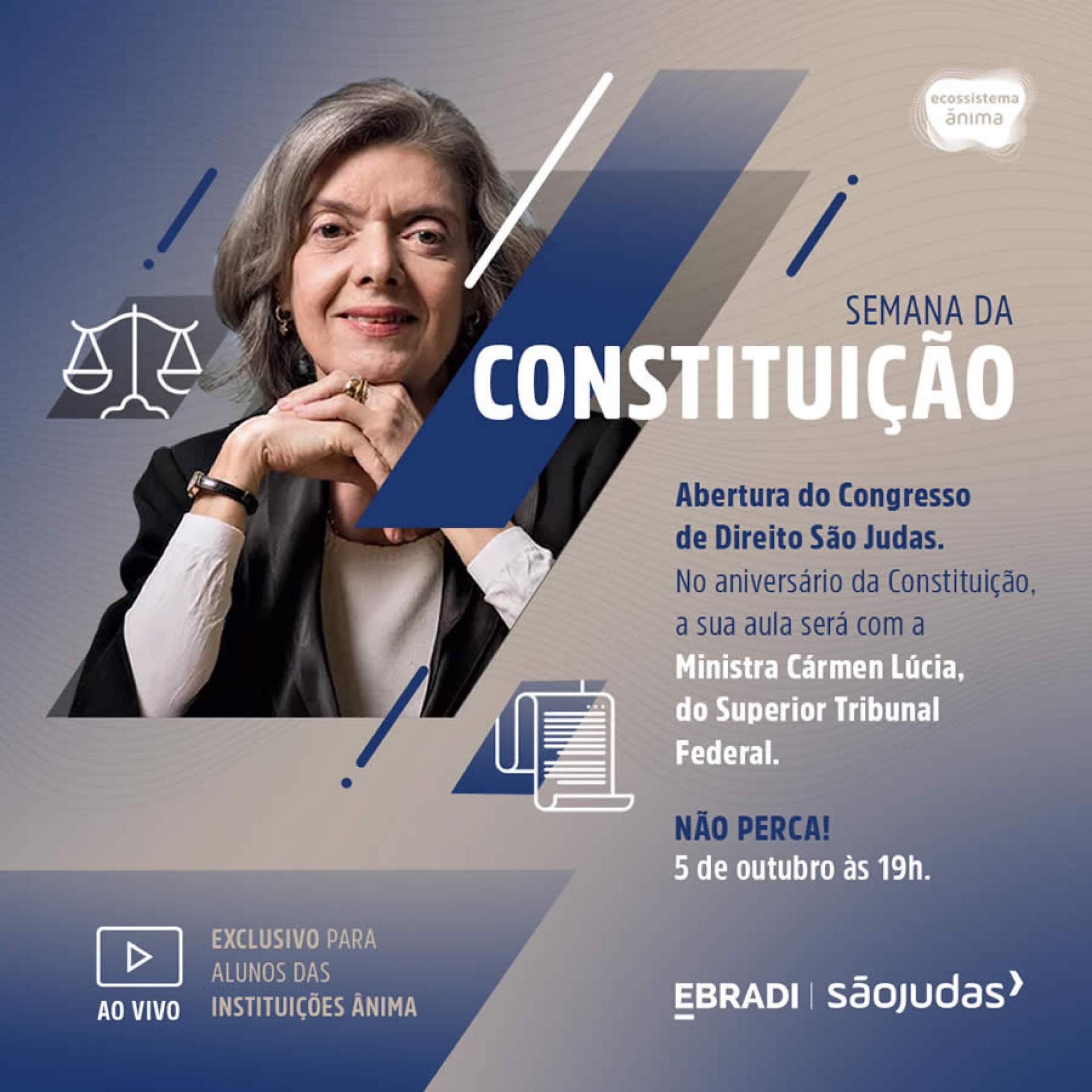 No momento em que valores democráticos, como a liberdade e a igualdade, estão sendo objeto de intenso debate, a Ânima Educação, por meio das suas instituições de ensino, São Judas, Una, UniBH, Faseh, UniSociesc, AGES, UniFG, UNICURITIBA, Unisul e EBRADI, irá comemorar os 32 anos da Constituição Federal, no dia 5 de outubro, às 19h, com uma aula magna da Ministra Cármen Lúcia Antunes Rocha, do Supremo Tribunal Federal. Também participa o Diretor Jurídico da Ânima Educação, Dr. João Batista Carvalho, que fará exposição sobre o ensino do Direito nas instituições da companhia e promoverá um bate-papo com a Ministra sobre a Constituição.
