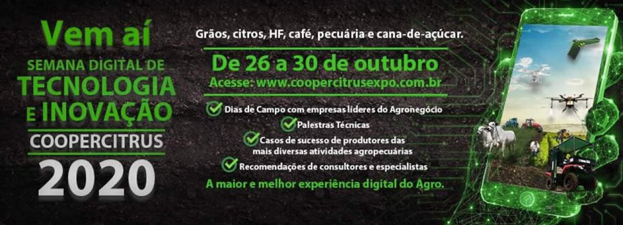 A Coopercitrus divulga a programação da Semana Digital de Tecnologia e Inovação, a ser realizada de 26 a 30 de outubro, pela plataforma digital por onde foi realizada a Coopercitrus Expo Digital. O objetivo do evento é levar os produtores rurais a refletir sobre o atual cenário do agronegócio, reafirmando a importância dessas pessoas para a sociedade e convidando-os a se engajarem em soluções cada vez mais digitais. A programação completa e as informações detalhadas sobre o evento estão disponíveis na plataforma www.coopercitrusexpo.com.br.