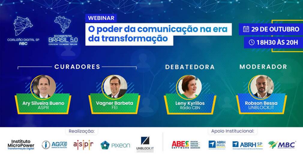 Organizado pela Coalizão Digital SP ABC , neste Webinar discutiremos como a Comunicação efetiva é a mola propulsora para uma liderança que transforma. É a chave mestra que auxilia a liderança, não só ao colocar todos em concordância, mas, principalmente, mudar crenças, cultivar o entendimento e alinhamento e criar senso de pertencimento no time. Transformações bem-sucedidas são aquelas em que os líderes estabelecem conexão e ganham suporte incondicional da organização, independentemente de silos, e isso só é facilitado e possível através da comunicação. Este é o poder da comunicação numa era de transformação.