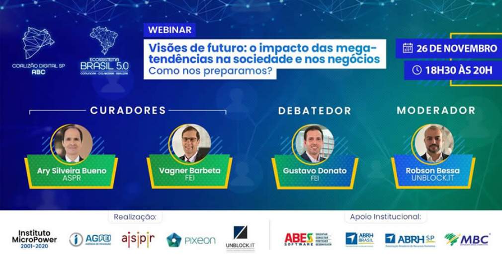 O Webinar terá como debatedor convidado, o professor Dr. Gustavo Donato, atual Reitor do Centro Universitário FEI, com curadoria de Ary Silveira Bueno da ASPR Consultoria de Gestão e Vagner Barbeta da FEI e moderação por Robson Bessa da UNBLOCKIT.