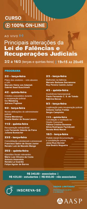 A Associação dos Advogados de São Paulo (AASP) promove de 2/2 a 16/3 (às terças e quintas-feiras), sempre das 19h15 às 20h45 (horário de Brasília-DF) o evento virtual “Principais alterações da Lei de Falências e Recuperações Judiciais” (a lei entrou em vigor no dia 23/1).